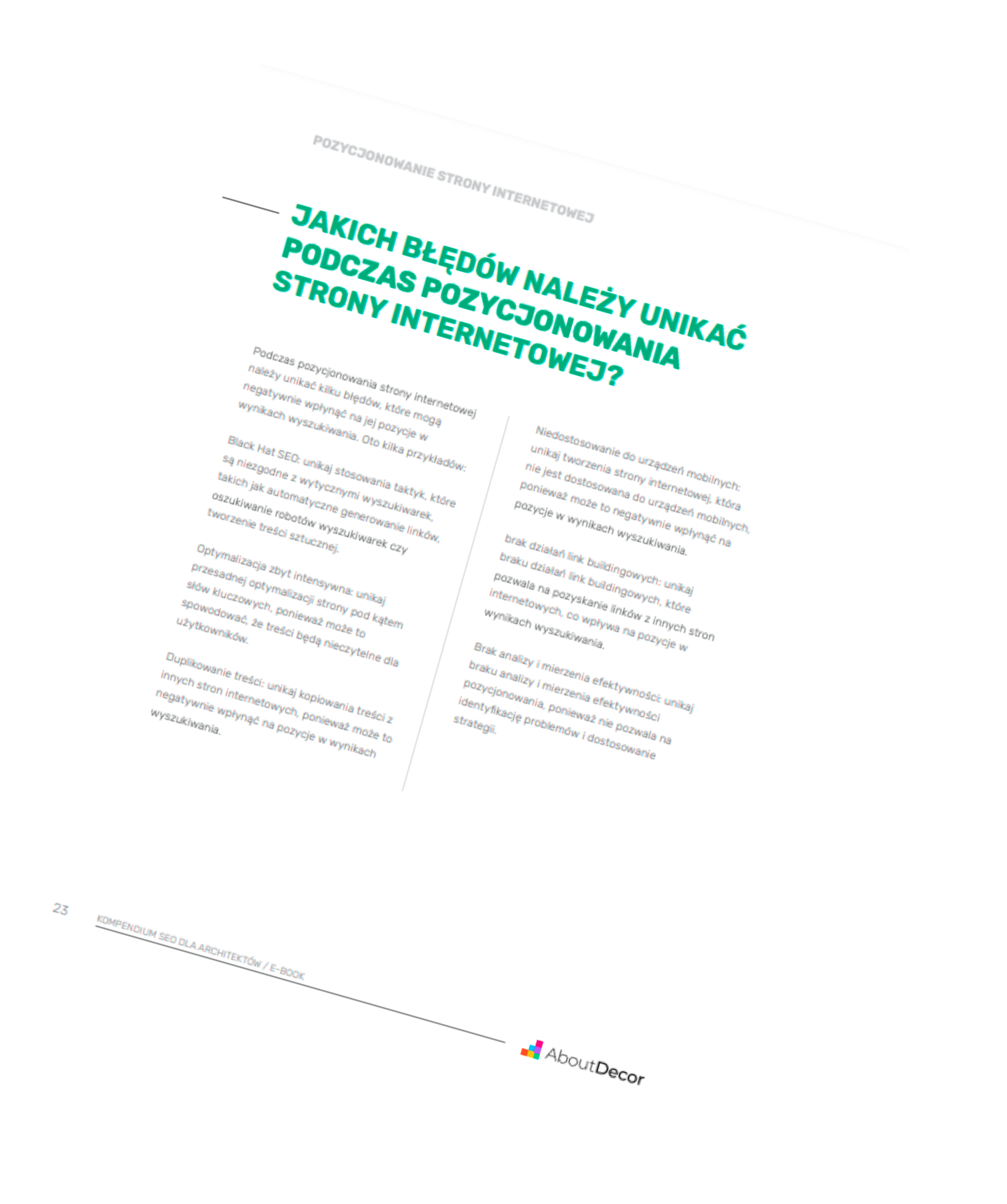 E-book ten stanowi kompleksowe źródło wiedzy, które pomoże architektom wykorzystać potencjał SEO w celu zwiększenia widoczności, renomy oraz sukcesu w branży. Dzięki tej wiedzy zyskasz wiele cennych informacji i pozyskasz nowych Klientów.